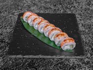 F. Halibut, oshinko, ogórek, sos spice-majo, płatki chilli ( rolka w tempurze)